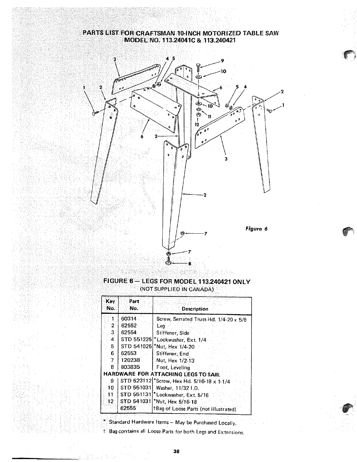 Sears 113.240421 - Legs for Model 113.240421 Exploded View and Parts List