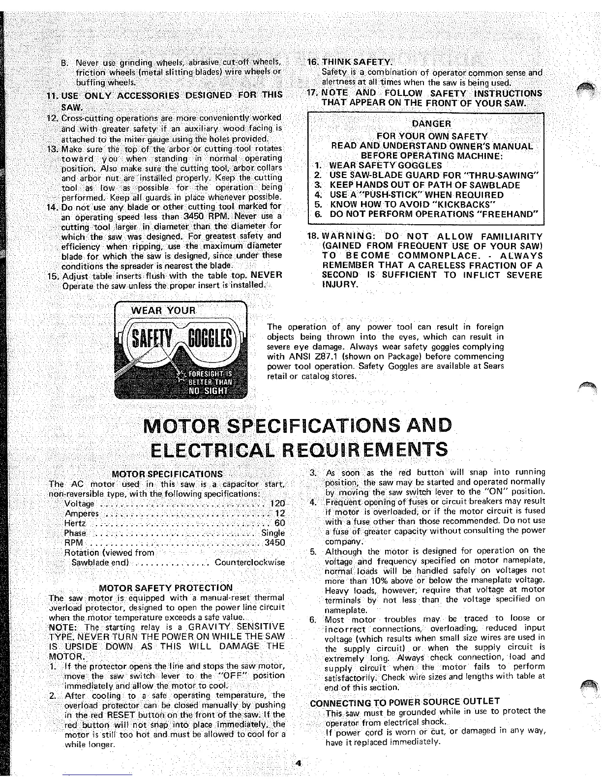 Sears 113.240421 - Motor Specifications and Electrical Requirements; Electrical Connection and Grounding