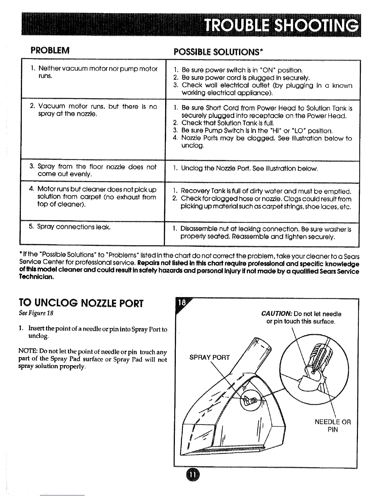 "If the "Possible Solutions" to "Problems" iisted In the chart do not correct the problem, take your cleaner to a Sears