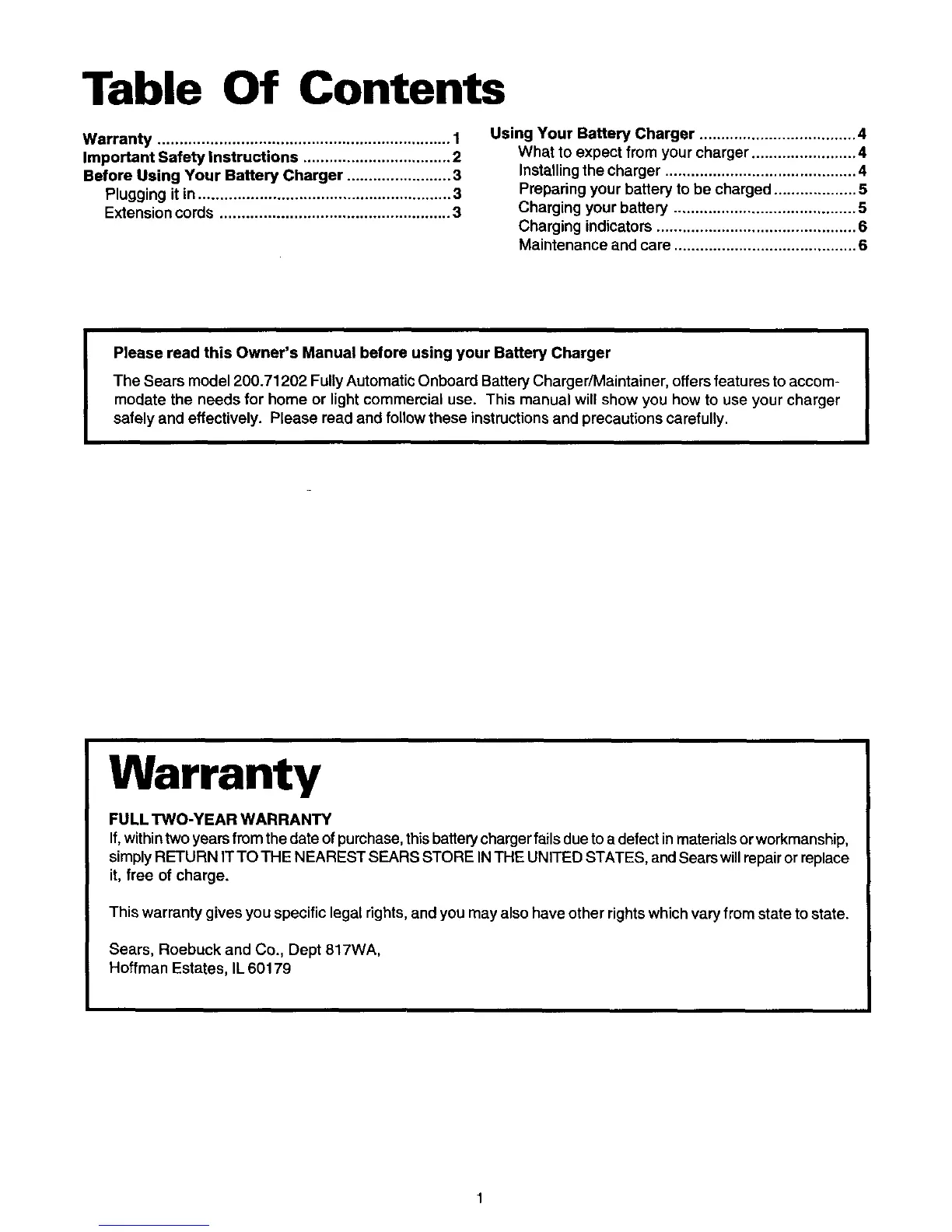 The Sears model 200.71202 Fully Automatic Onboard Battery Charger/Maintainer, offers features to accom-