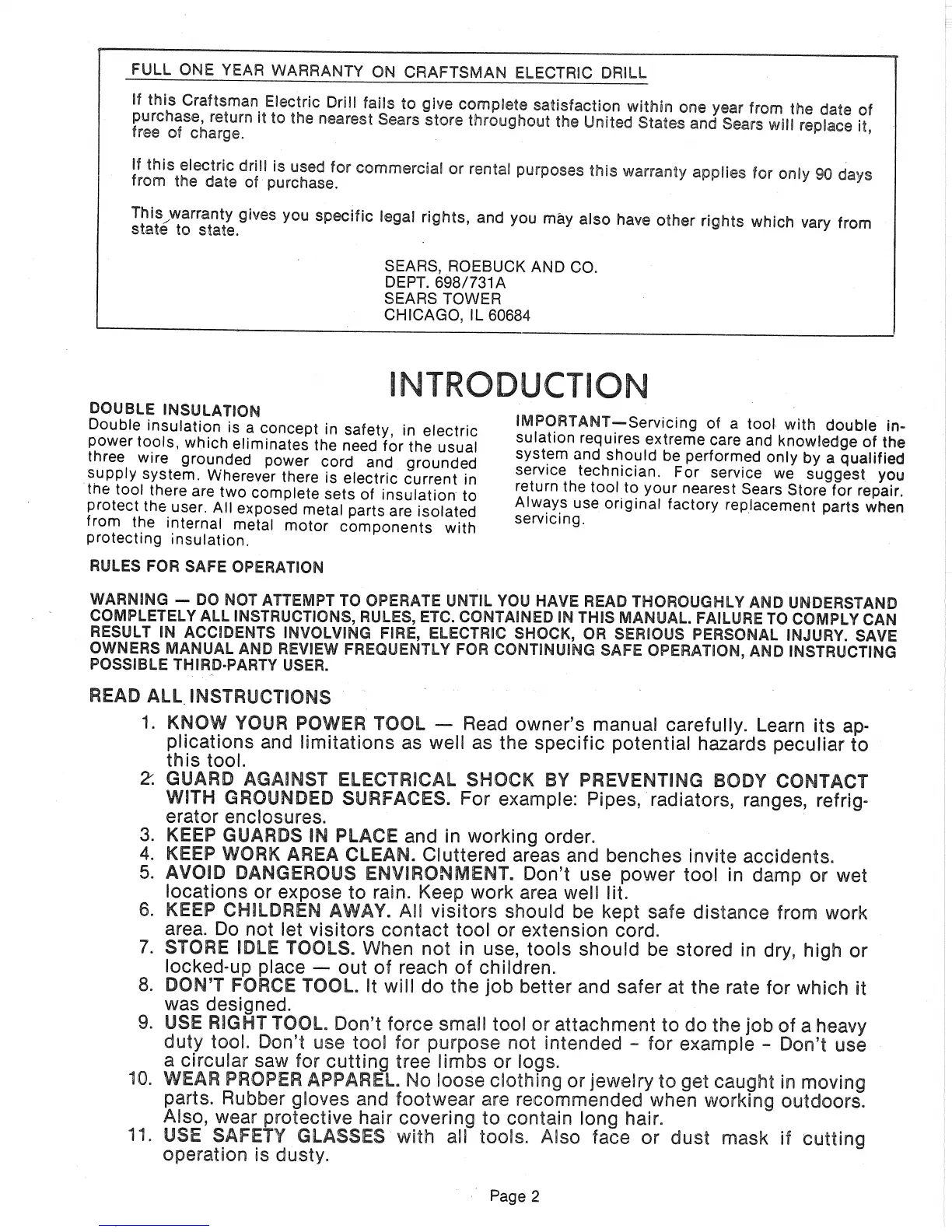 Sears 315.10491 - Introduction and Double Insulation; Safe Operation Guidelines; Warranty and Service Information; Warranty Terms and Conditions
