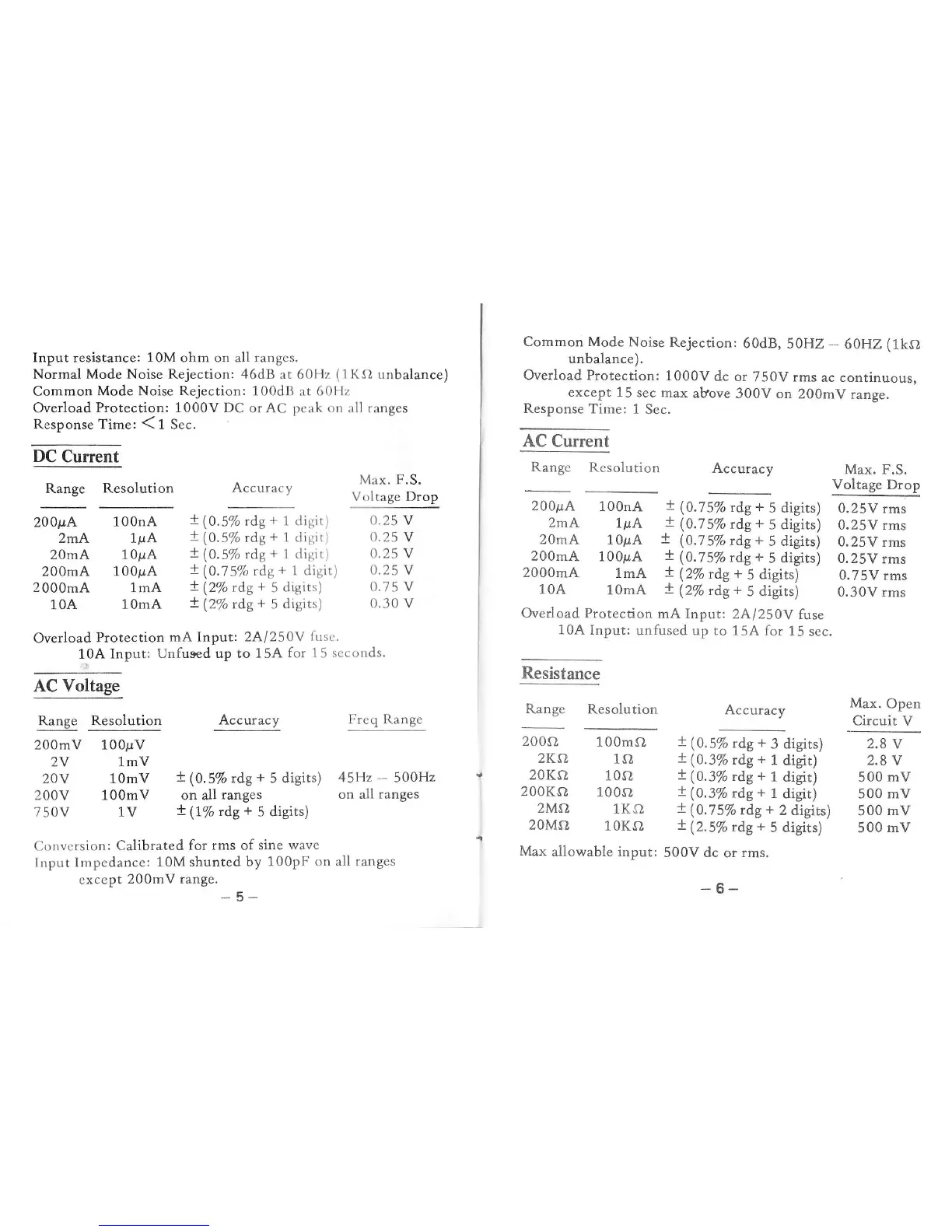 Sears 82413 - AC;DC Current and AC Voltage Specifications