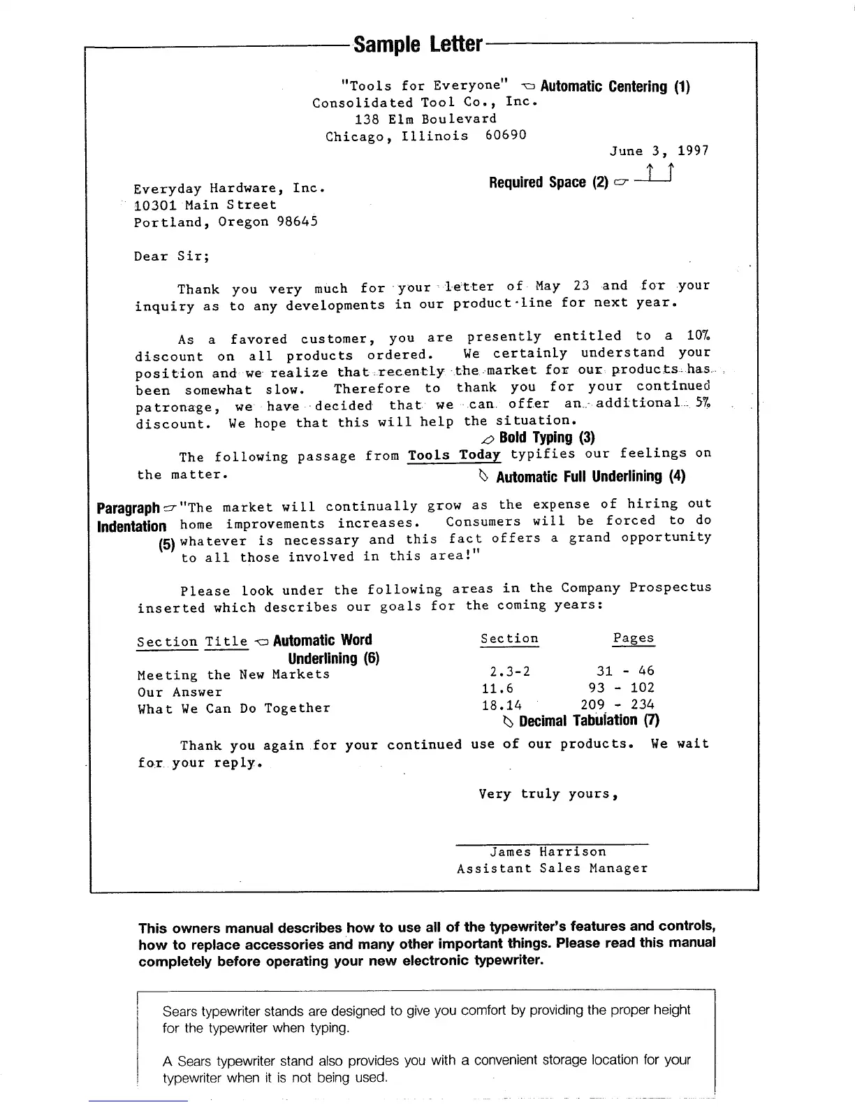 This owners manual describes how to use all of the typewriter's features and controls,