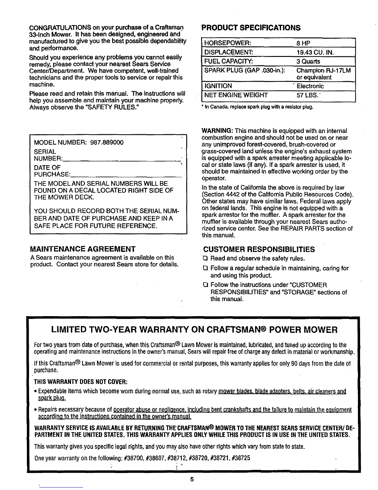 Fortwo yearsfrom dateof purchase,whenthis Craftsman® LawnMowerismaintained,lubricated,andtuned up accordingto the