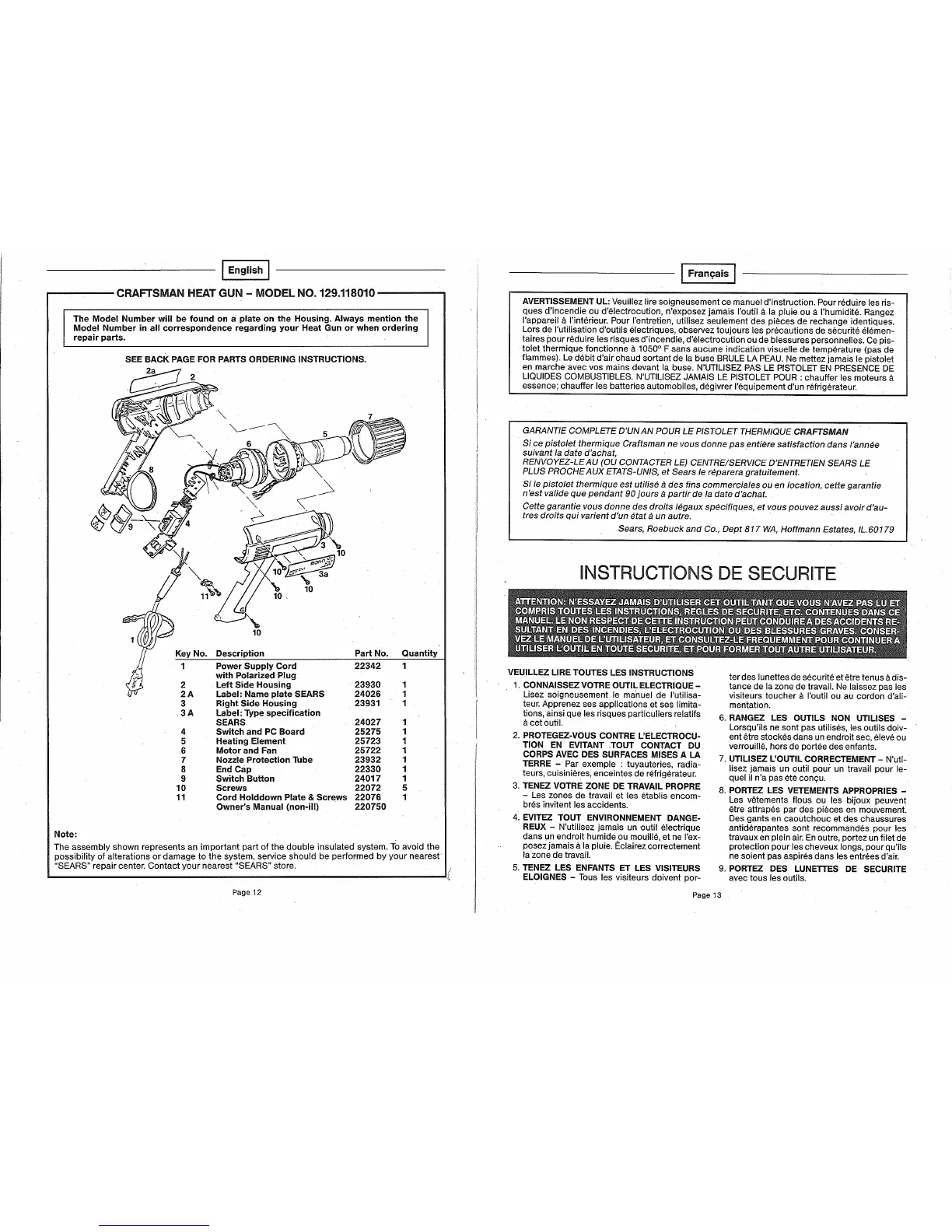CRAFTSMAN HEAT GUN - MODEL NO. 129.118010
