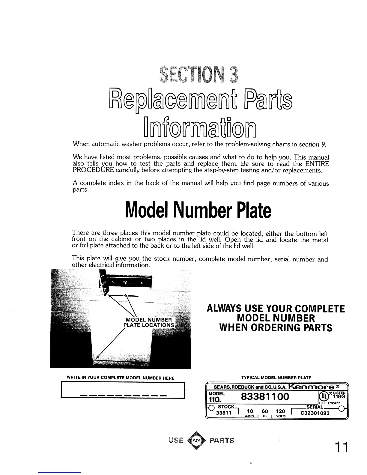 Sears Kenmore - Replacement Parts Information & Model Plate; Model Number Plate Location and Importance