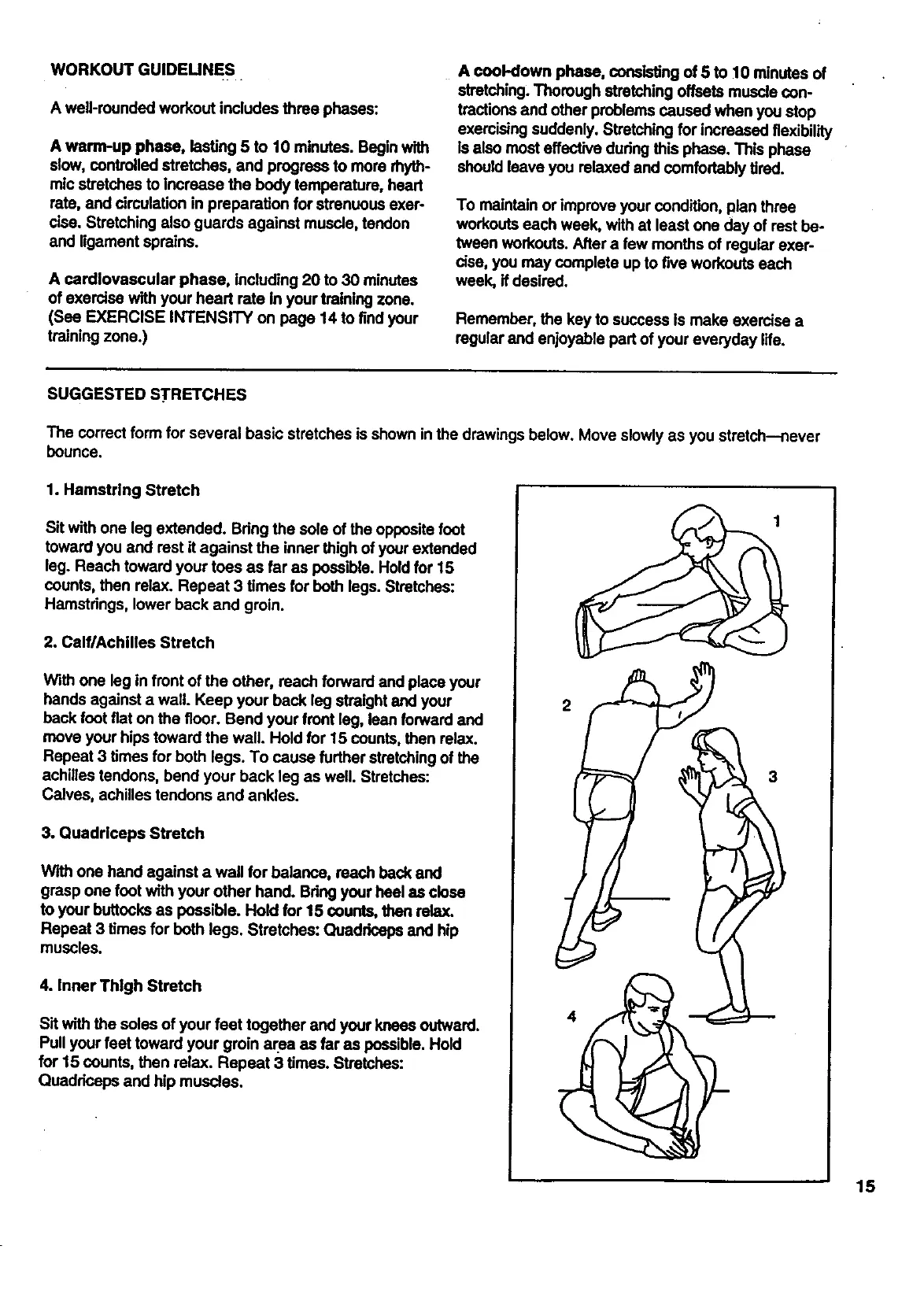 The correct form for several basic stretches is shown in the drawings below. Move slowly as you stretch--never