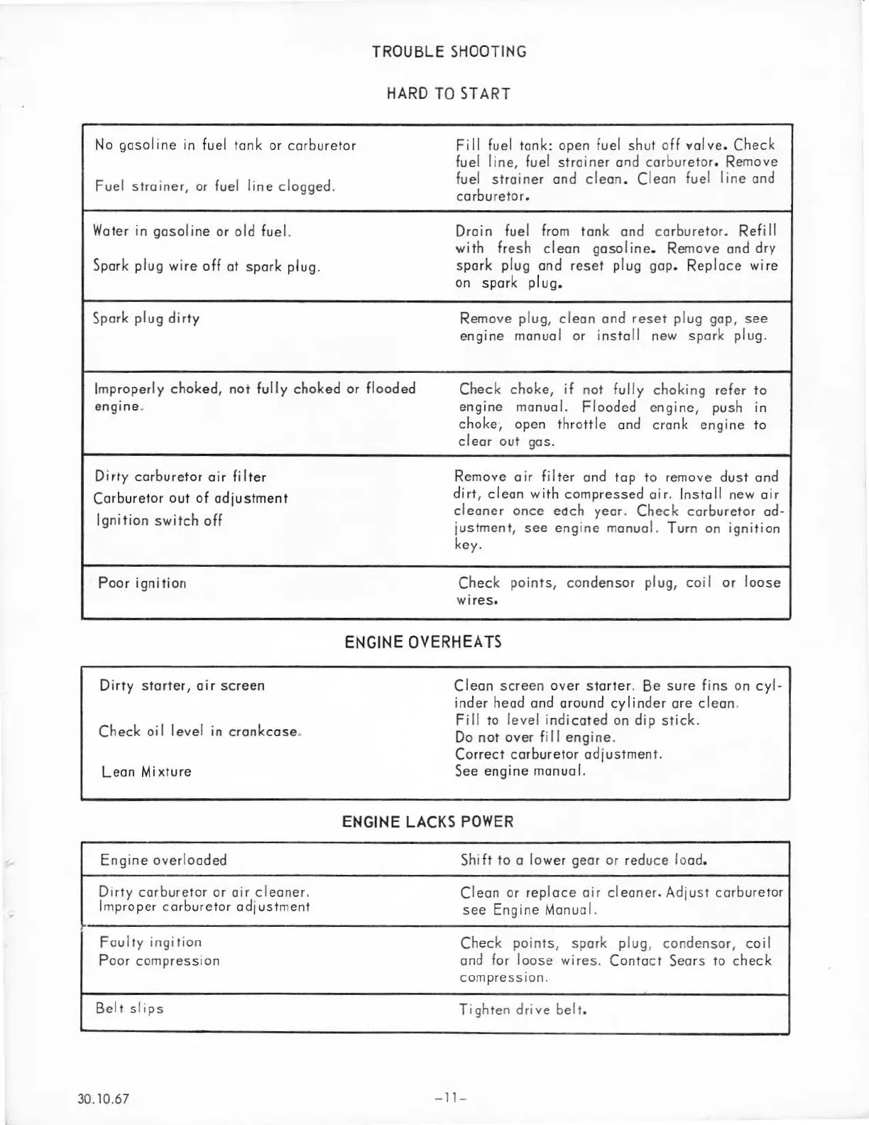 Sears Super 12 - Trouble Shooting Guide; Hard to Start Issues; Engine Overheating Problems; Engine Lacks Power Causes