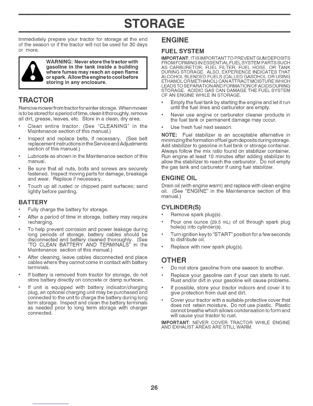 WARNING: Never store the tractor with