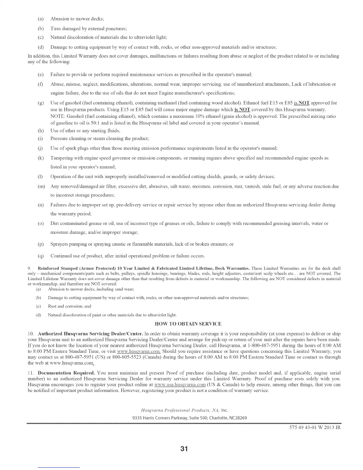 10o Authorized Husqvarna Servicing Dealer/Center. In order to obtain warranty coverage it is your responsibility Catyour expense) to deliver or ship