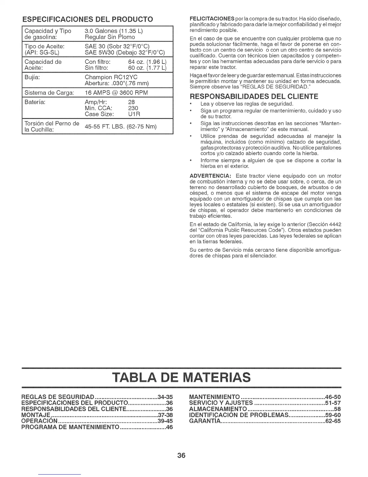ADVERTENCIA: Este tractor viene equipado con un motor