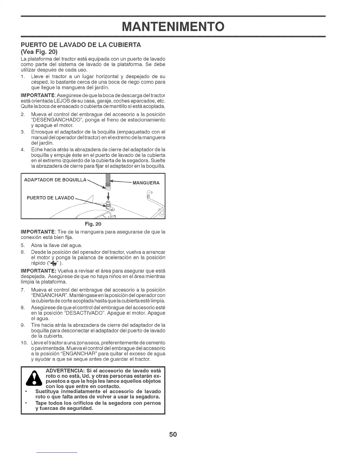 manual del operador del tractor) en el extremo de la manguera