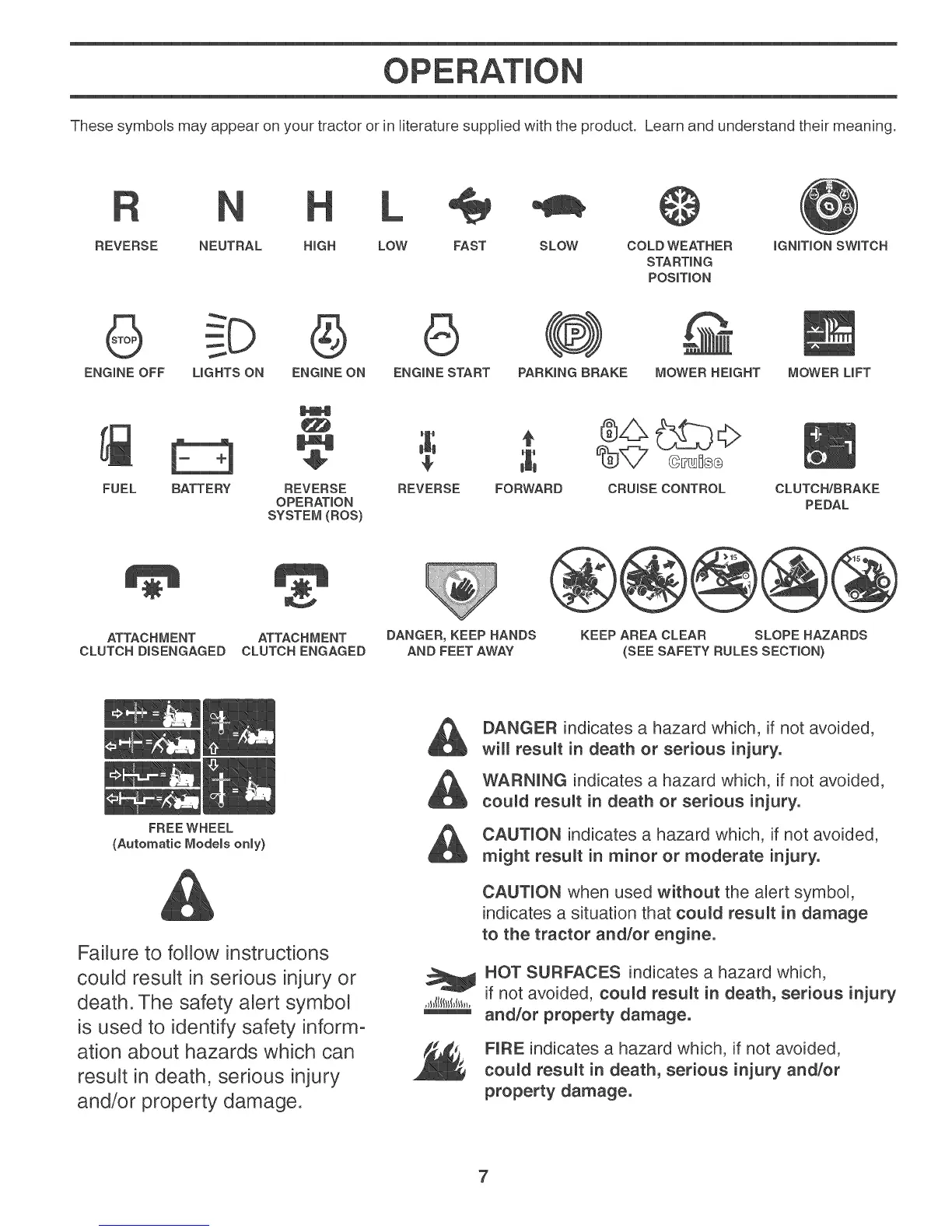 These symbols may appear on your tractor or in literature supplied with the product. Learn and understand their meaning.