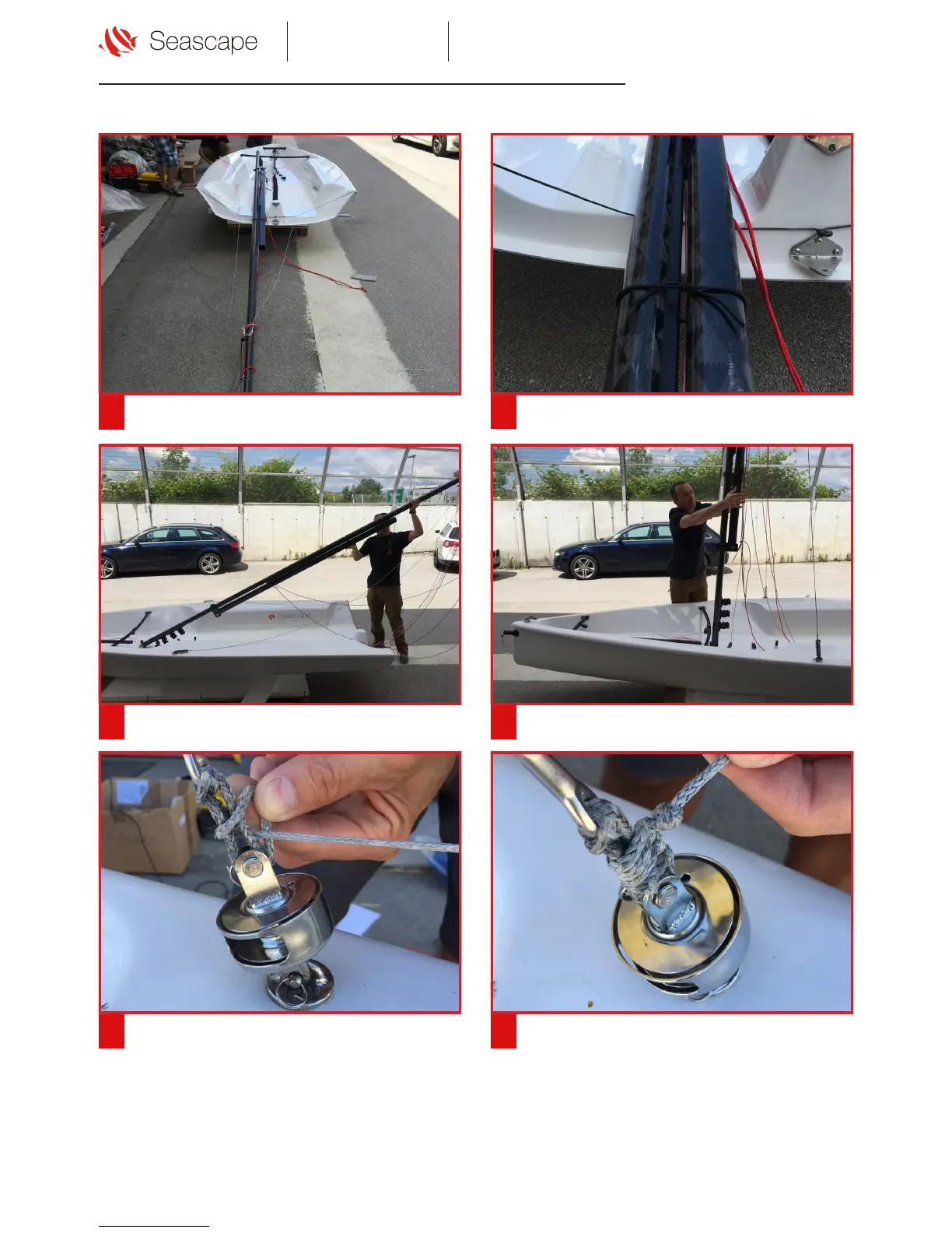 Lift the mast with mast base and mast foot aligned. Hold it and take the front stay.