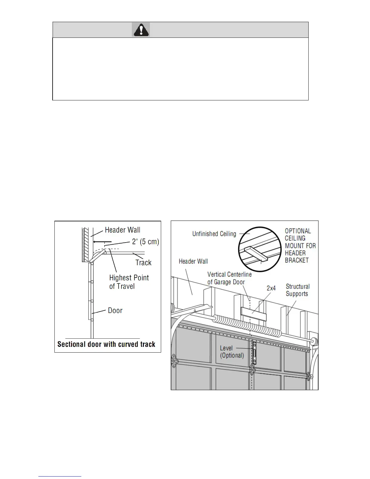 otherwise garage door might not reverse when required. DO NOT install header bracket over drywall.