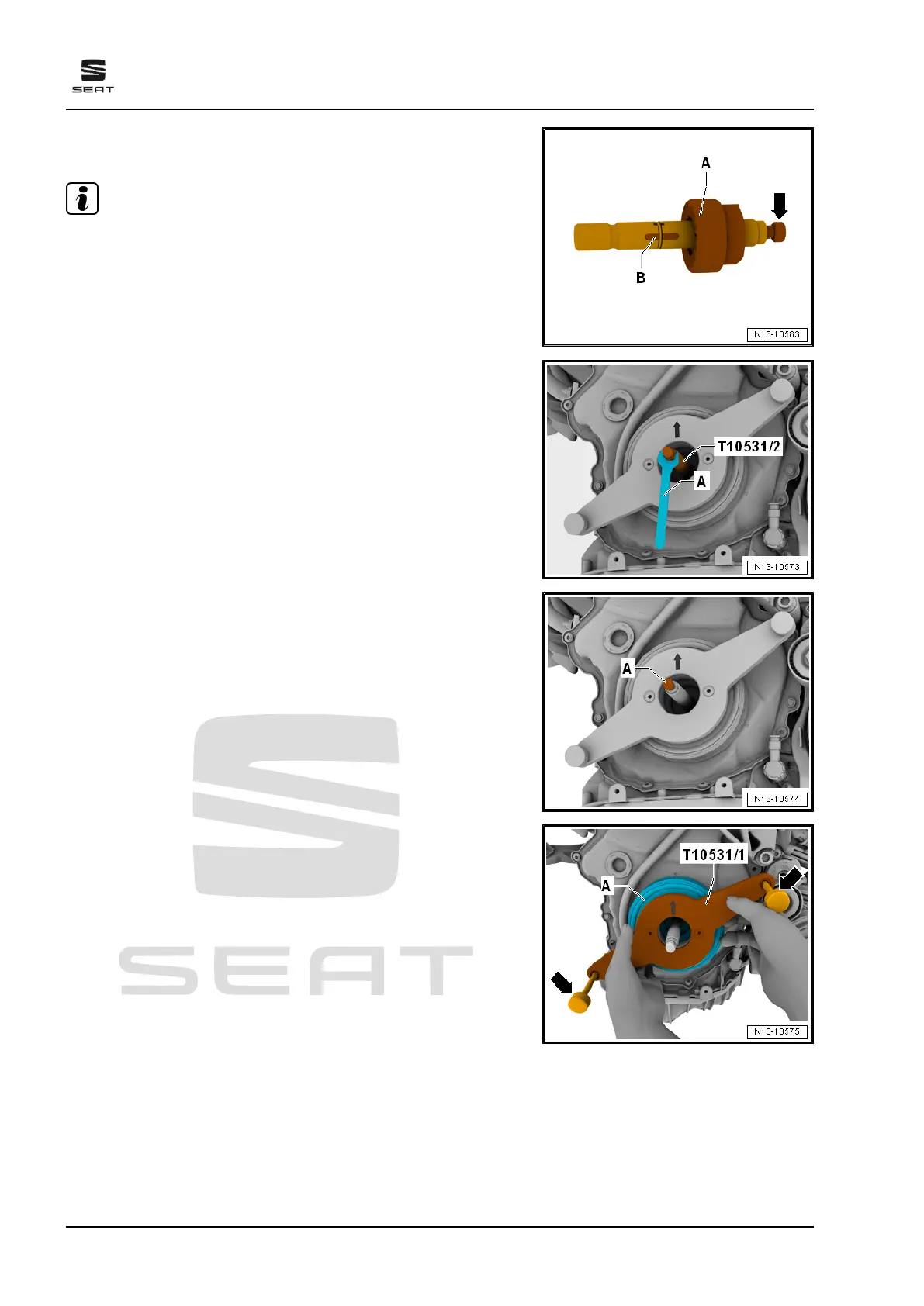 – Screw clamping pin - T10531/2- into crankshaft, and tighten it