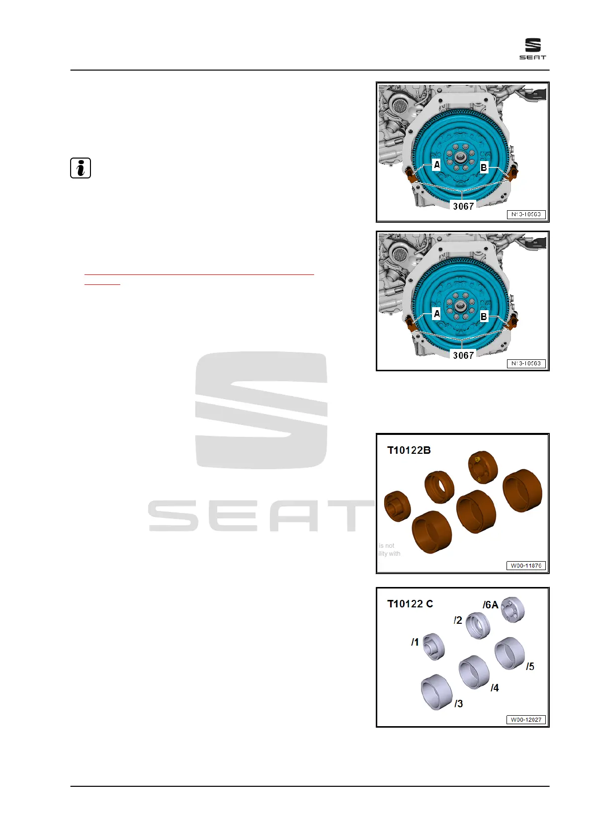 – Insert counter-hold tool - 3067- in hole -B- of cylinder block.