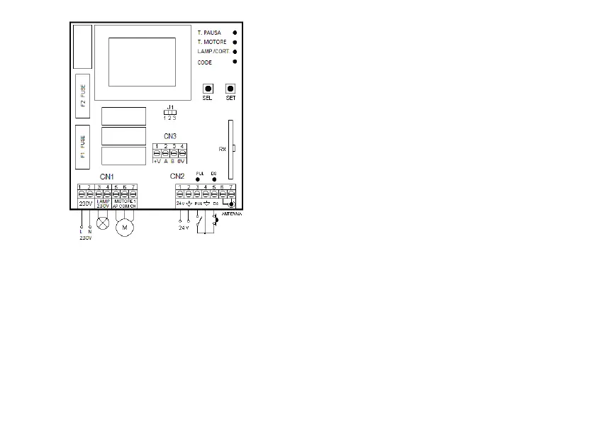 La centrale permette l’alimentazione ed il collegamento di Fotocellule, Coste pneumatiche (NC).