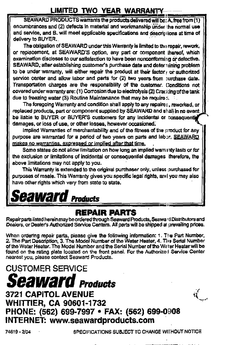 Seaward F600 - Limited Two Year Warranty; Repair Parts; Customer Service