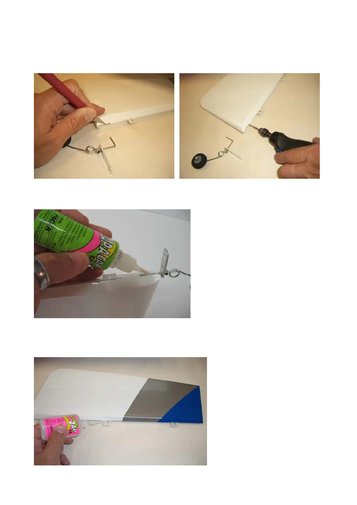 Insert the three hinges in their appropriate slots of the rudder, and glue them with some drops of