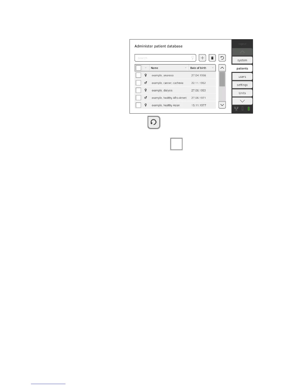 Restoring a seca patient file 1. Press the patients tab.