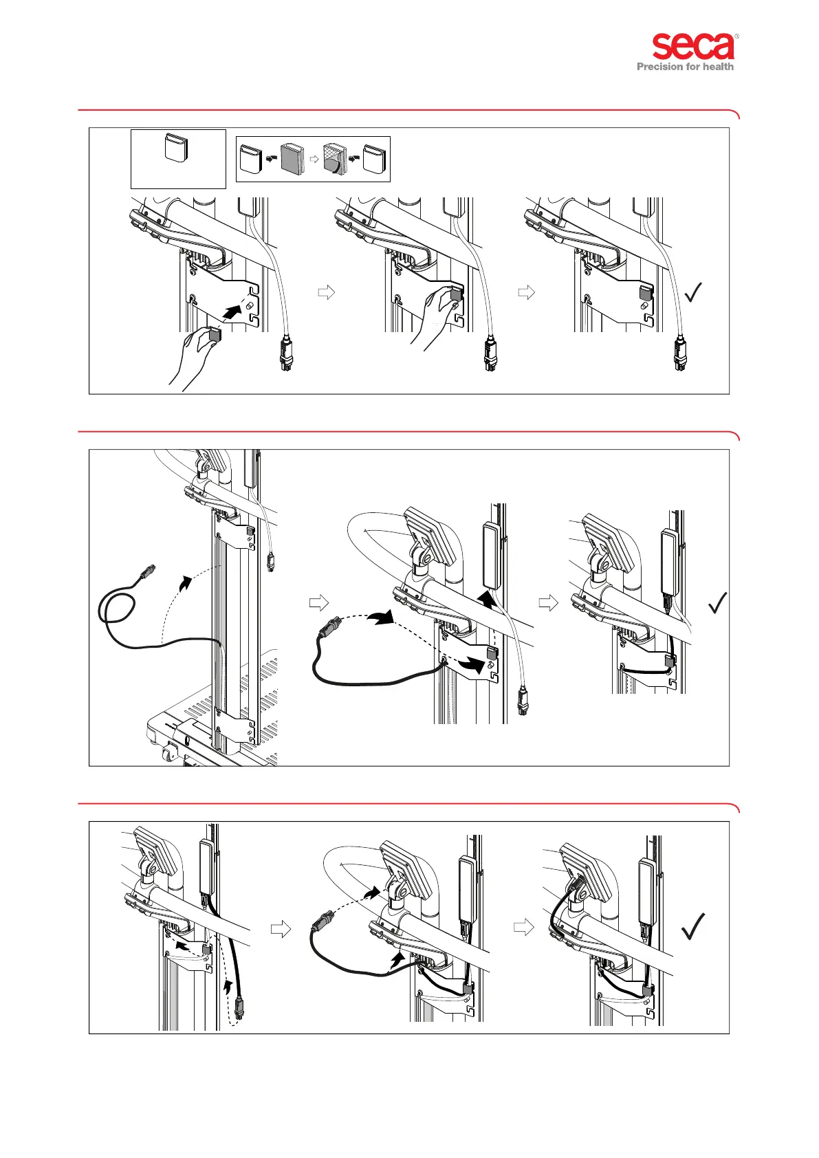 Seca 654 - 14. Kabelclip anbringen• Placing cable clip; 15. Displaykabel an Messstab anschließen • Connecting display cable to measuring rod; 16. Messstabkabel am Display anschließen • Connceting measuring rod cable to display