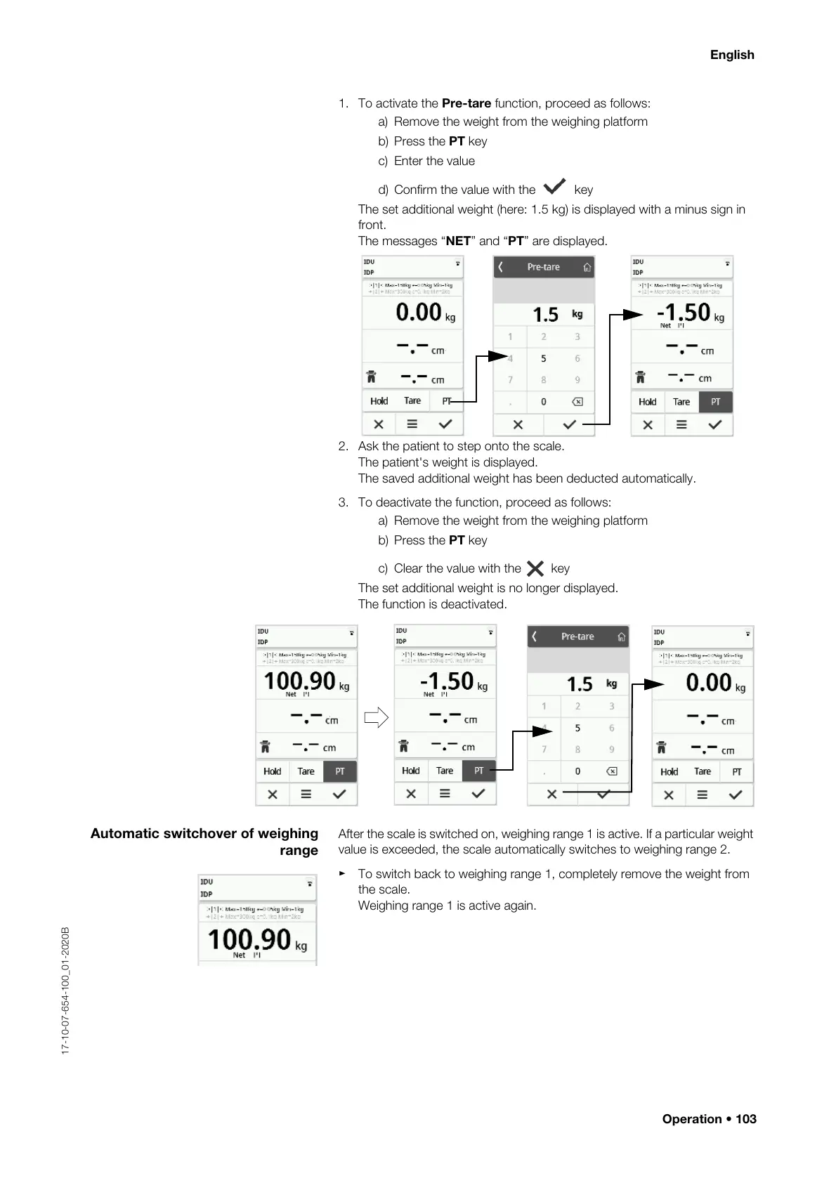 ► To switch back to weighing range 1, completely remove the weight from