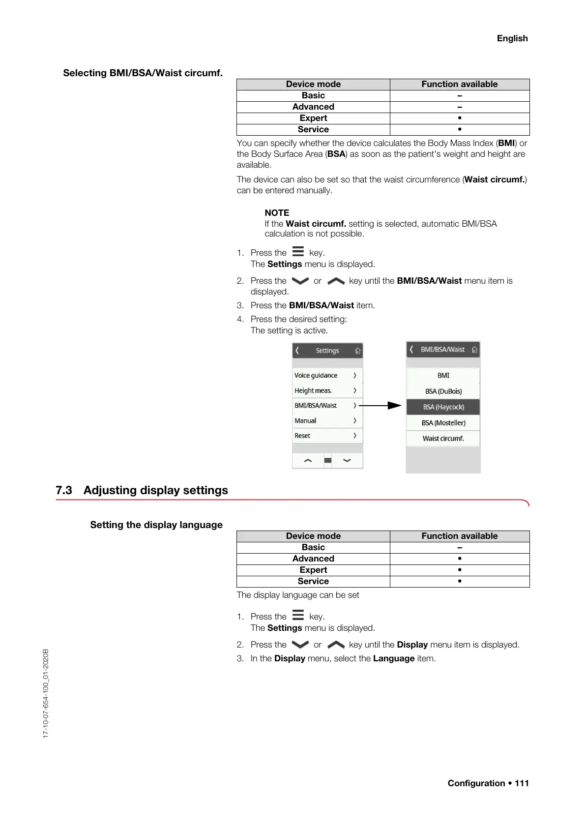 If the Waist circumf. setting is selected, automatic BMI/BSA