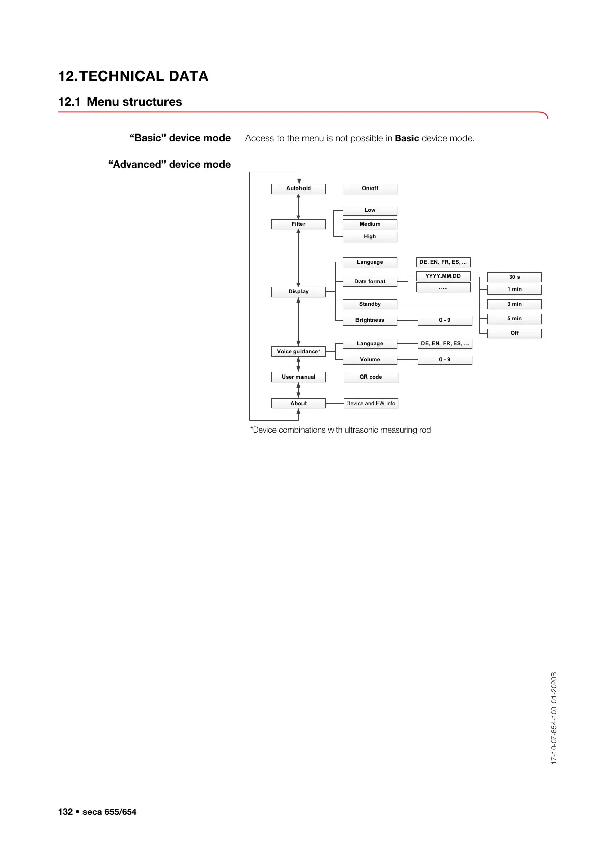 Seca 654 - 12. Technical data; 12.1 Menu structures; “Basic” device mode; “Advanced” device mode