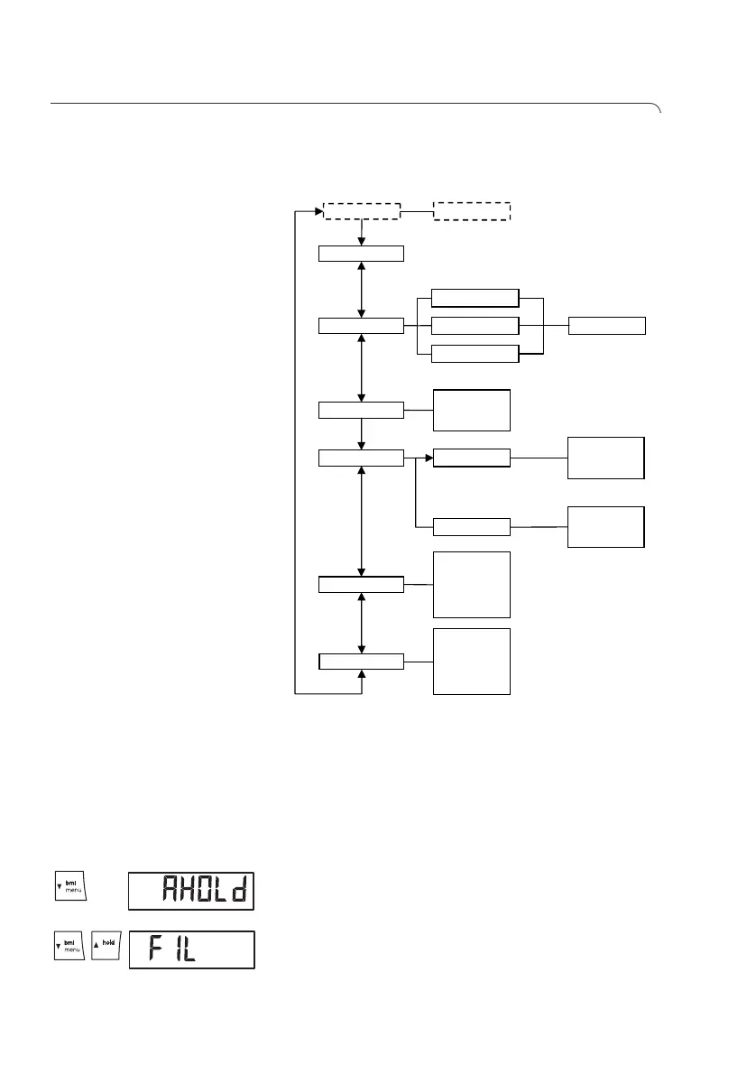 2. Mantenha a tecla de seta (bmi/menu) premida, até