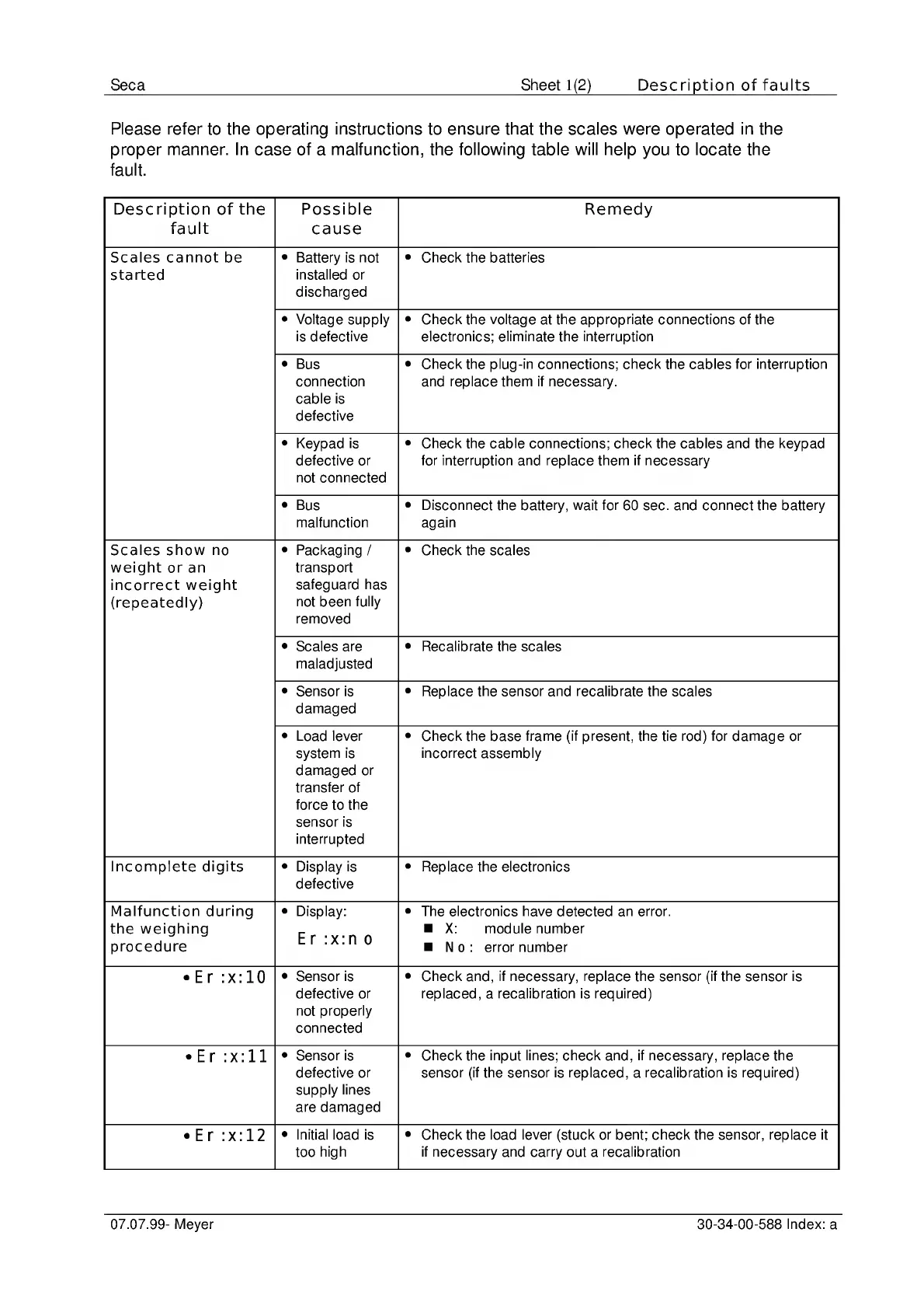 Seca 780 - Description of faults; Scales cannot be started; Scales show no weight or an incorrect weight (repeatedly); Incomplete digits