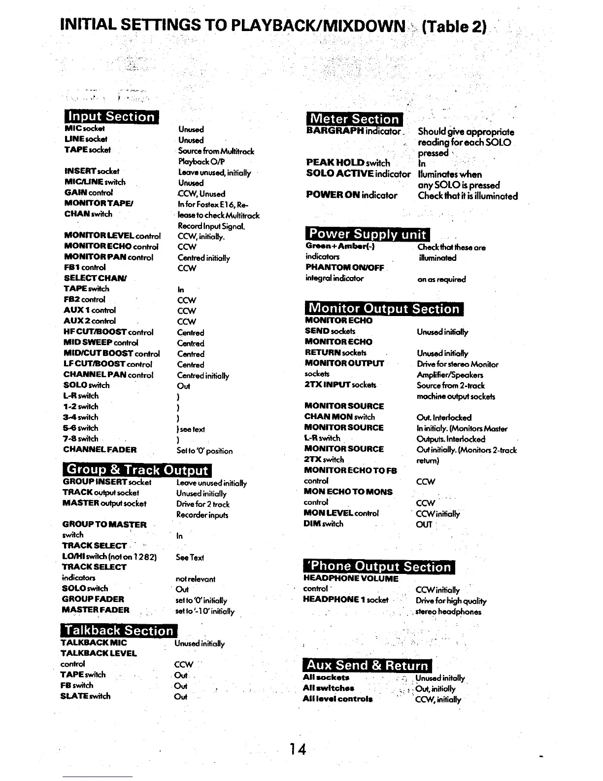 Seck 1882 - PLAYBACK;MIX-DOWN INITIAL SETTINGS TABLE; Control Settings Summary for Playback