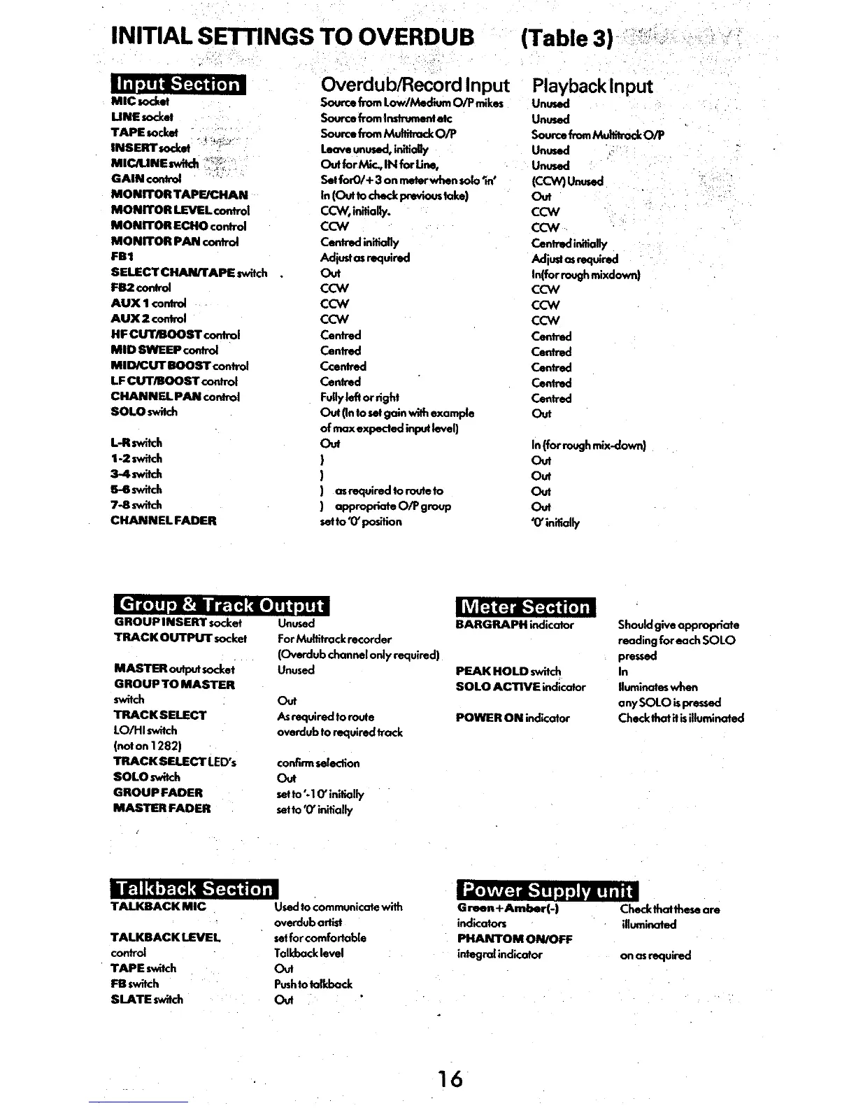 Seck 1882 - OVERDUB INITIAL SETTINGS TABLE; Control Settings Summary for Overdubbing