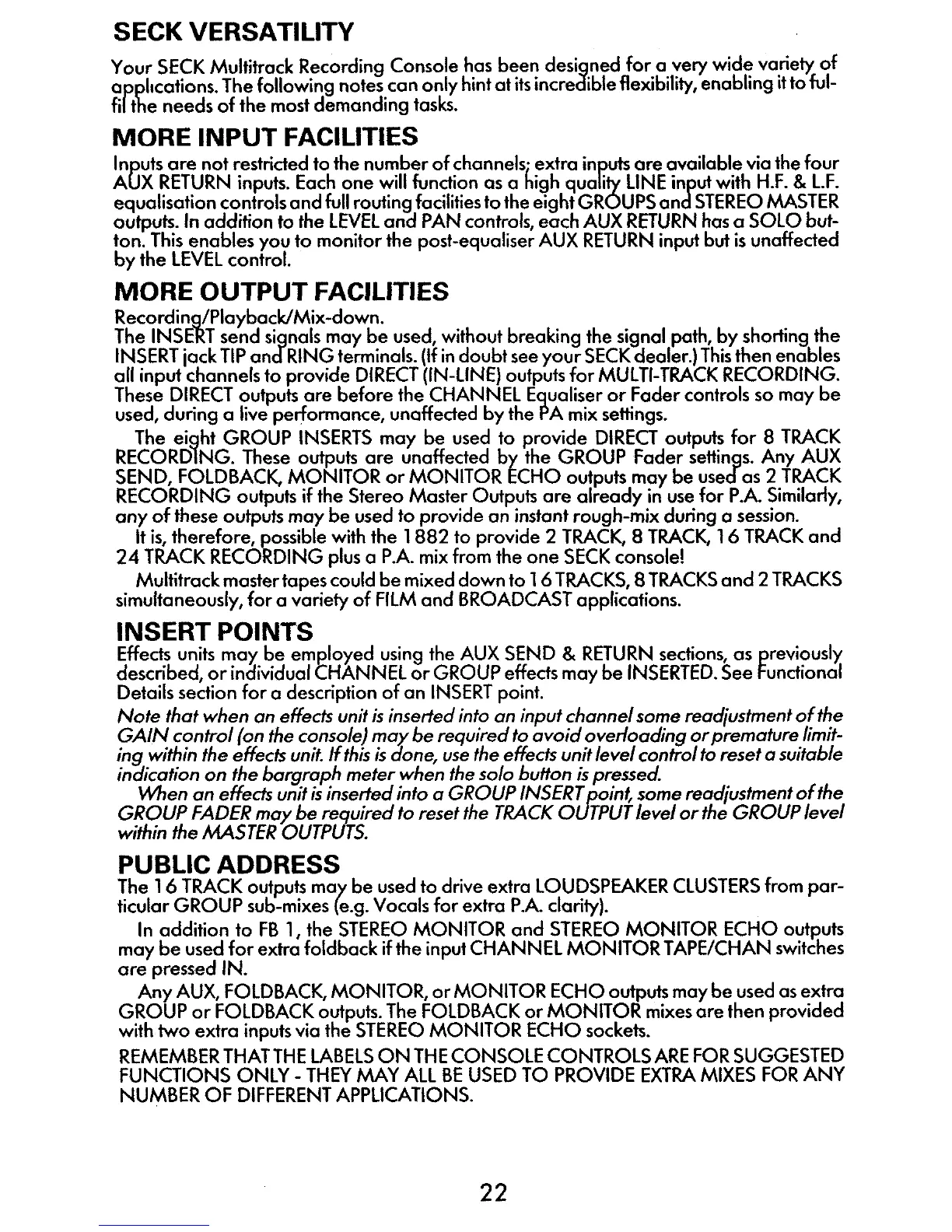 Seck 1882 - SECK CONSOLE VERSATILITY; Expanded Input;Output and Recording Options; Insert Point Usage and P.A. Applications