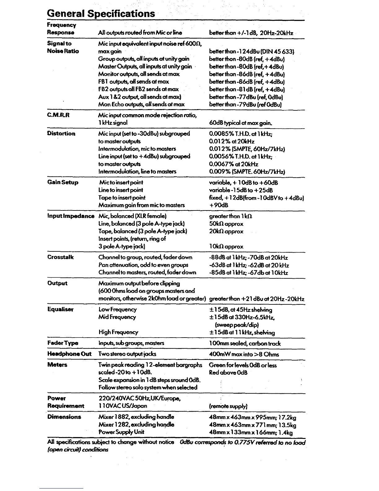 Seck 1882 - GENERAL SPECIFICATIONS; Audio Performance Specifications; Control, Power, and Physical Specs