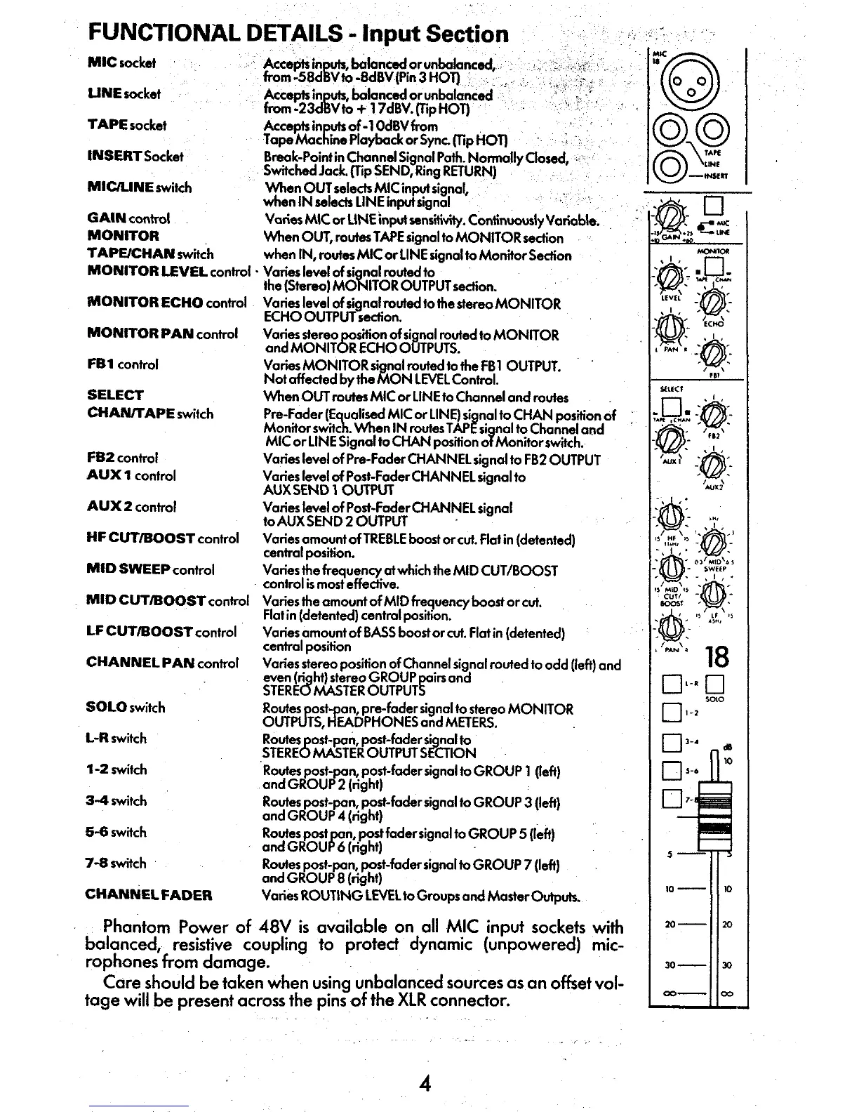 Seck 1882 - FUNCTIONAL DETAILS - INPUT SECTION; Input Connectors, Switches, and Gain; Monitor, EQ, and Routing Controls