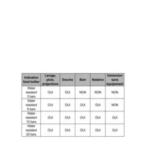 L’indication water resistant (étanche) ne s’applique qu’aux montres neuves sorties de l’usine. Les agents externes