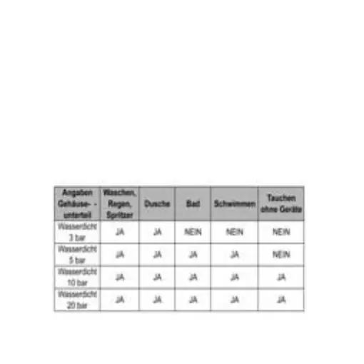 Die Angabe „wasserdicht“ ist nur für fabrikneue Uhren gültig. Äußere Einflüsse können die Wasserundurchlässigkeit