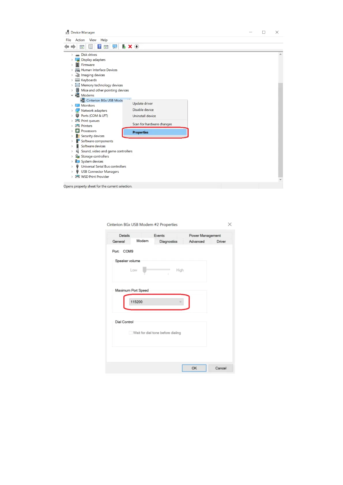 Change the COM port speed can be done in properties -> Modem -> Maximum Port Speed. Set
