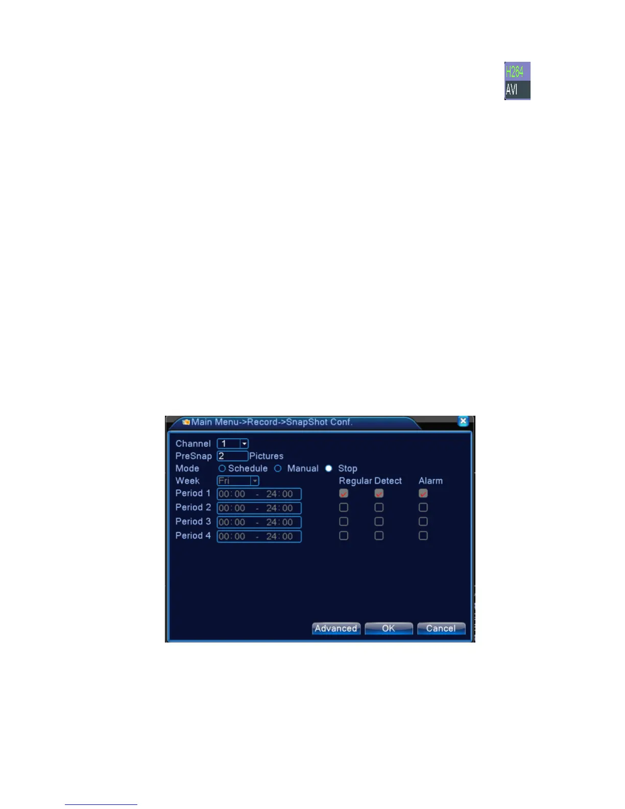 Setup snapshot parameters for different channels.At first time it's set for 24hours snapshot
