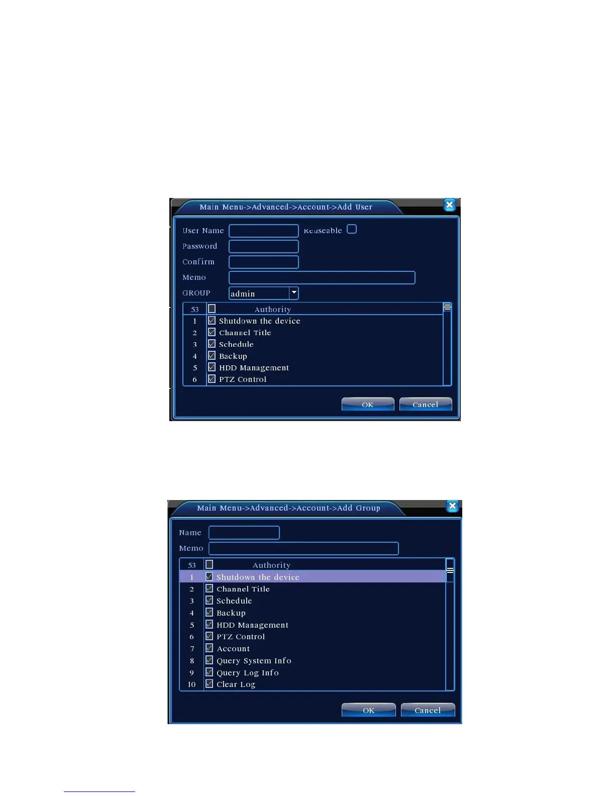 【Add Group】Add a user group and set the purview. There are 33 different purviews: shut down the