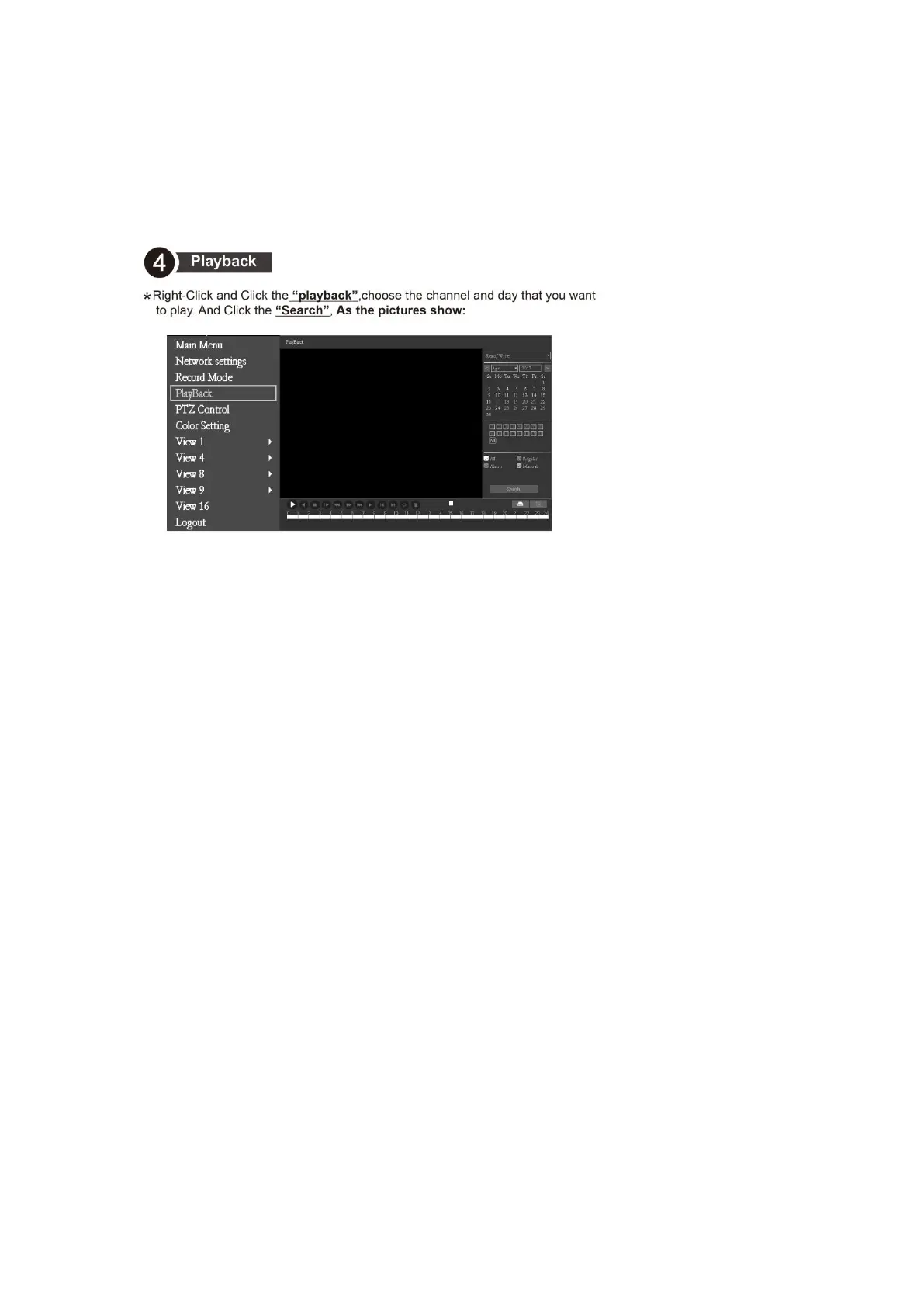 Right-Click and Click the “playback”,choose the channel and day that you want to play.