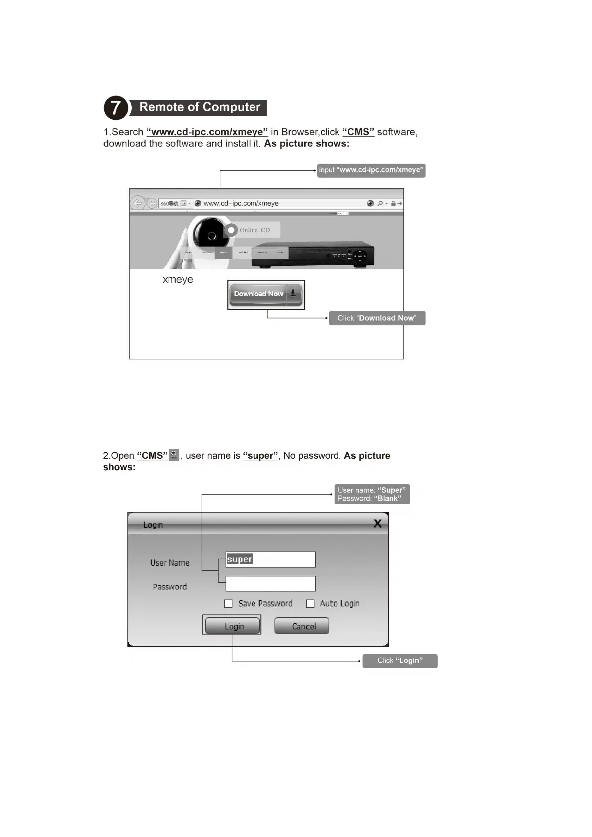 7.2 Open “CMS” , user name is “super”, No password. As picture shows: