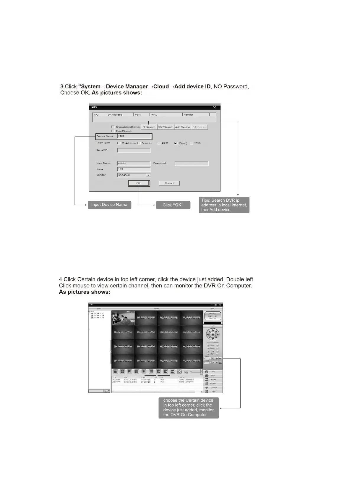7.3 Click “System→Device Manager→Cloud→Add device ID, NO Password, Choose OK.