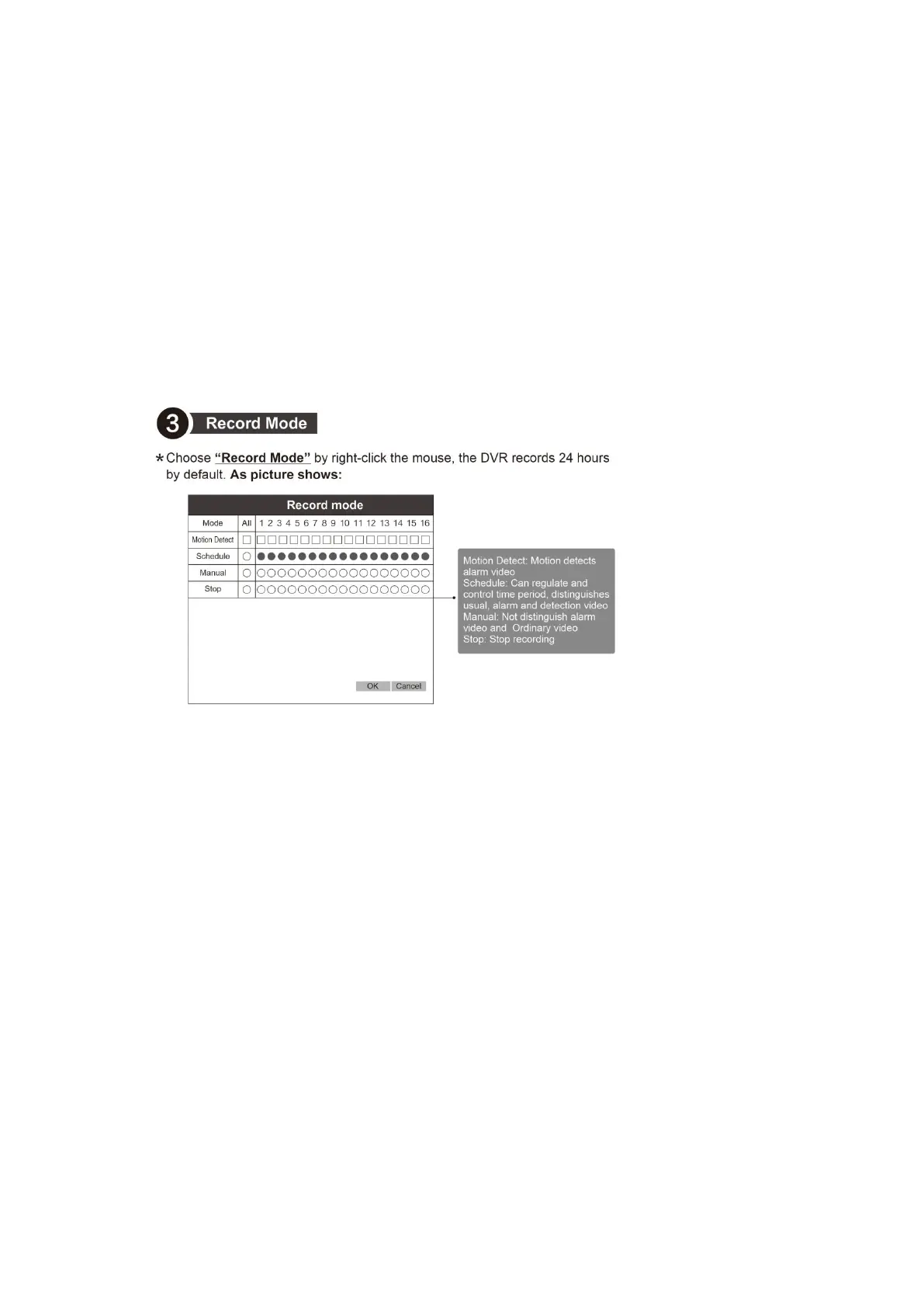 Choose Record Mode” by right-click the mouse, the NVR records 24 hours by default. As