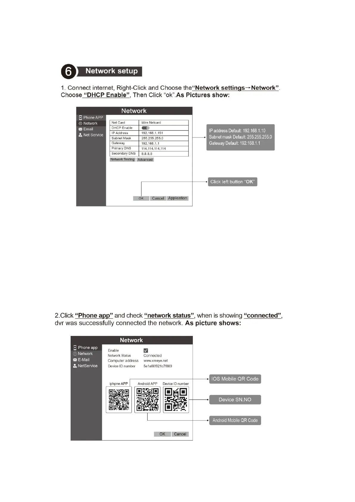 6.2. Click “Phone app and check “network status”, when is showing “connected”, nvr