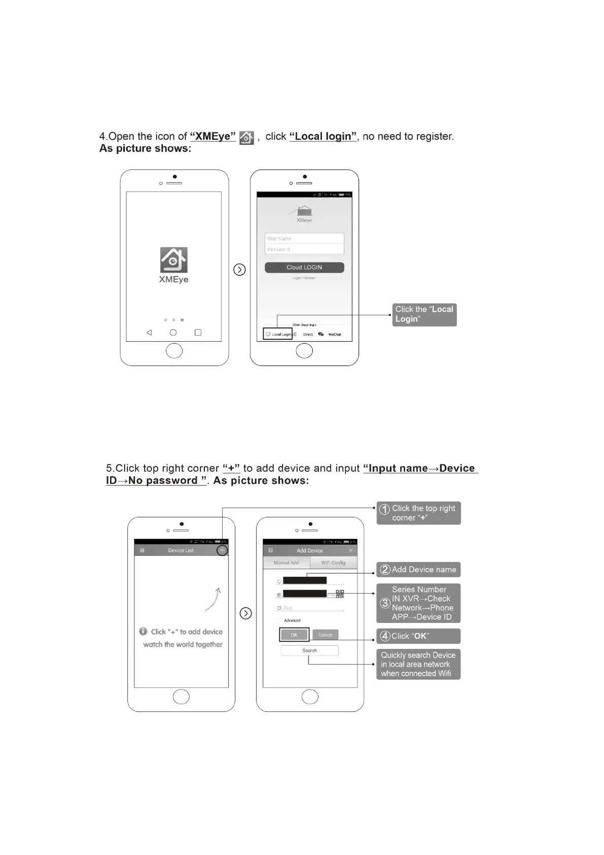 6.4. Open “XMeye” app on the phone's desktop, click Local login”, no need to register. As