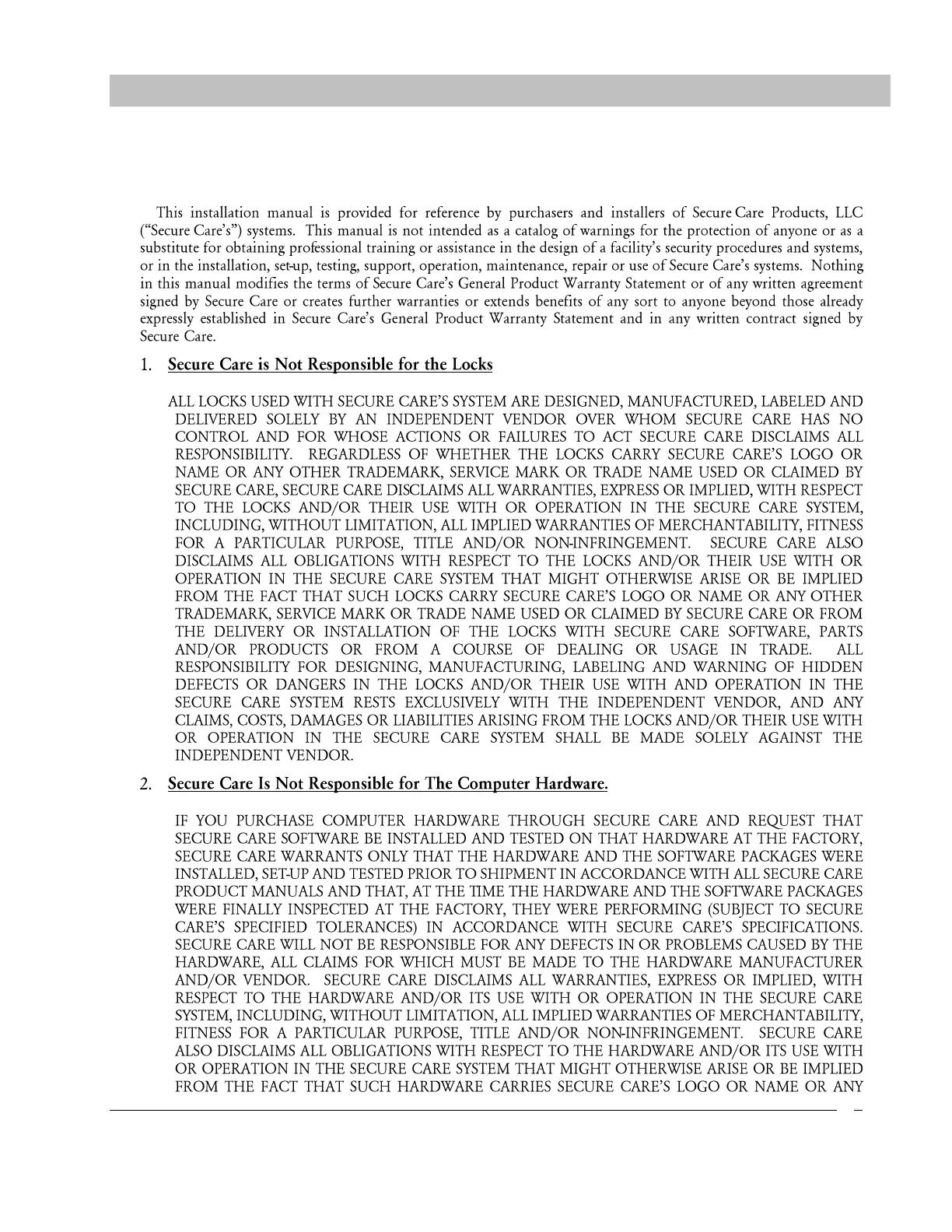 Secure Care KinderGUARD ID - Section 1 Important Notices; Please Read this Manual before Beginning the Installation of a Secure Care System