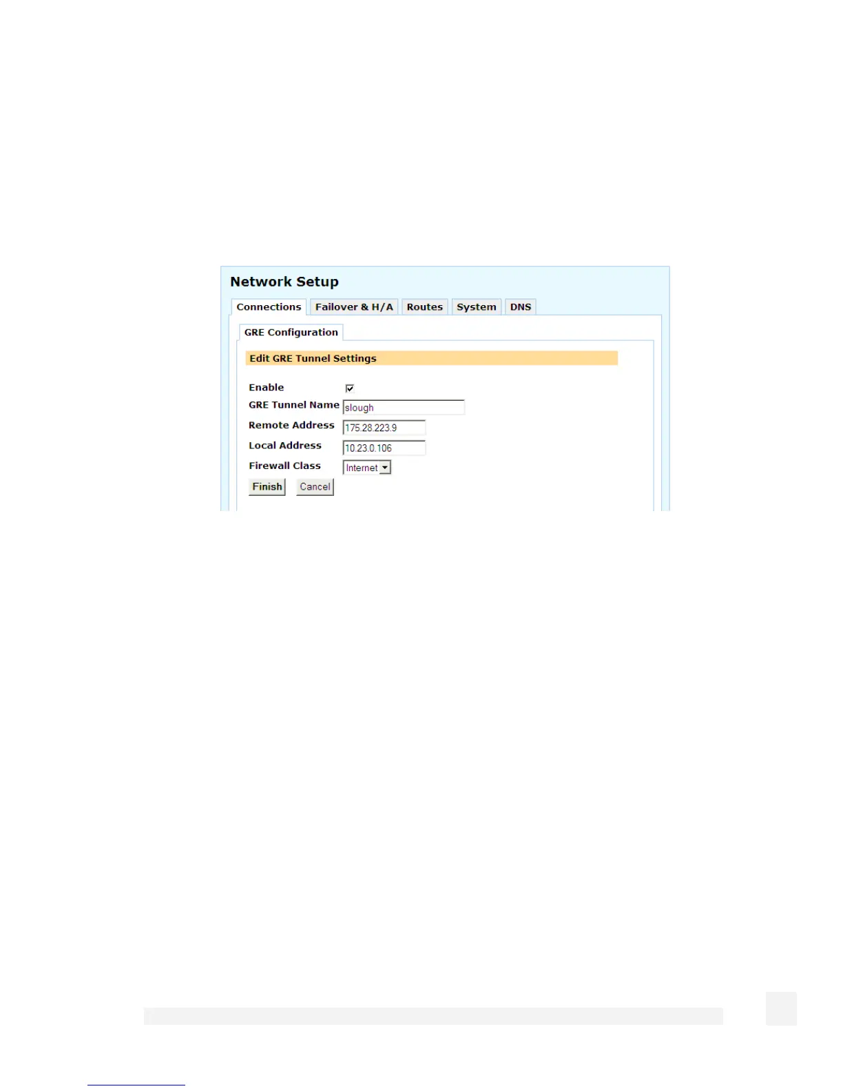 Click Finish. The GRE interface now appears in the main Network Setup table.