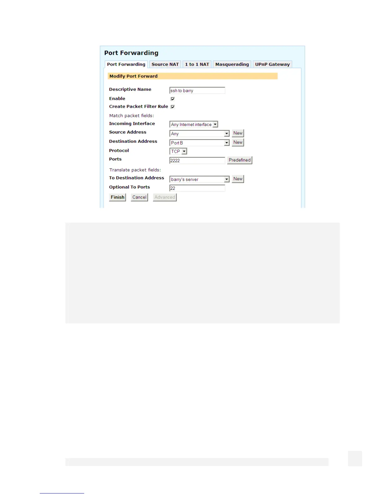 The example shown in the screenshot above forwards the SSH (secure shell) protocol to
